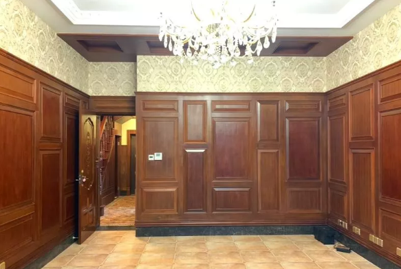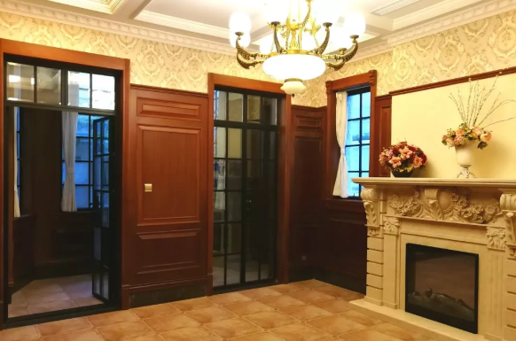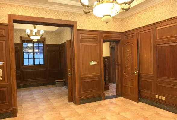 室內大面積的采用了歐式護墻板及實木吊頂裝飾,雖有所增加裝修成本,但確顯得富麗大氣,還具有恒溫隔音的作用;