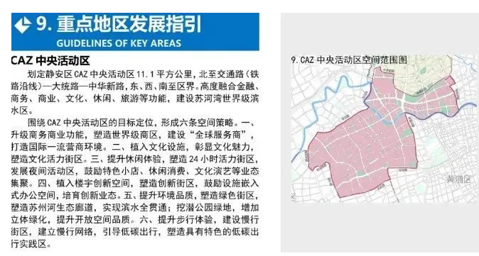 蘇河灣有不少競(jìng)爭(zhēng)對(duì)手。其定位的四個(gè)主要產(chǎn)業(yè)中,金融技術(shù)與數(shù)據(jù)服務(wù)與陸家嘴竹園有重疊,文化創(chuàng)意與徐匯濱江相類似,商貿(mào)與虹橋商務(wù)區(qū)存在競(jìng)爭(zhēng),因此《上海市靜安區(qū)單元規(guī)劃(含重點(diǎn)公共基礎(chǔ)設(shè)施專項(xiàng)規(guī)劃)》將蘇河灣列入靜安區(qū)CAZ中央活動(dòng)區(qū)內(nèi),通過與南京西路商務(wù)區(qū)一體化來增強(qiáng)其商務(wù)吸引力。