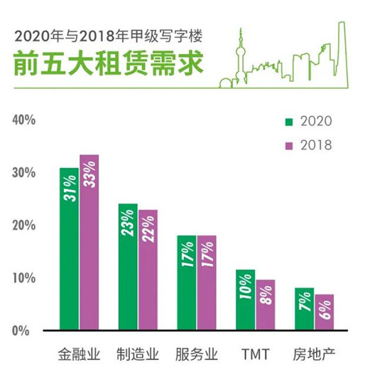 報(bào)告顯示,2020年金融業(yè)(31%)仍然是寫字樓需求首位,金融業(yè)持續(xù)領(lǐng)跑上海寫字樓租賃市場(chǎng)需求;此外高端制造業(yè)(23%)、服務(wù)業(yè)(17%)、TMT(10%)及房地產(chǎn)業(yè)(7%)等行業(yè)需求也持續(xù)攀升。