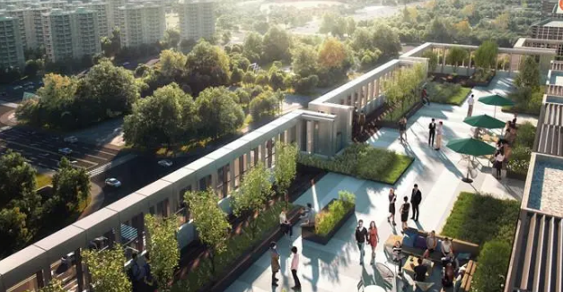 項(xiàng)目總建筑面積約14萬方,其中包括約8.3萬平方米辦公建筑面積,呈現(xiàn)地上9層,地下3層的5棟生態(tài)辦公集群,以及約8000平方米商業(yè)建筑面積,700個(gè)停車位。