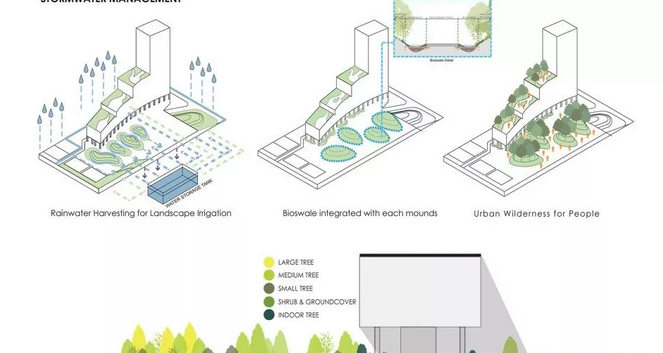 ? ? ? 在雨水管理方面,在每個土墩的底部產(chǎn)生生物洼地,以有效地調(diào)節(jié)排水模式,同時允許徑流緩慢地穿過